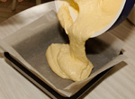 Utiliser un moule que l'on a foncé (tapissé) avec du papier cuisson légèrement beurré (cliché b); y verser la pâte (cliché c) et cuire environ 25 minutes dans un four pré-chauffé à 180° (chaleur traditionnelle non tournante .