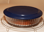 Laisser tiédir jusqu'à pouvoir manipuler le moule et retourner le gateau dans un pyrex, que l'on couvre pour que le flan garde bien son humidité (cliché h).
